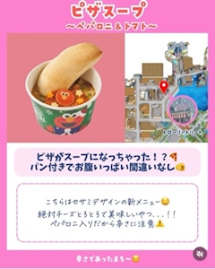 みさきです こんばんわに ユニバ冬のフード特集 第1弾です ピザスープ ピザスープってイマイチピンと 来ないんですけど どんなの ピザ味のスープなのかな ピザが入ってるスープなのかな けどピザの入ったスープか どう見ても このパンをちぎりながら 浸して食べるのかな やりたいかも 冬にピッタリかもですね 寒空の下で 温かいスープにパン浸して 食べたいものです 友達とわけわけするのが いいかもしれません 外で食べたいかも私 エルモかわいいから 食べたくないな ではでは!また みさき