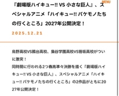 こんばんはあかねです この前Xで流れてきた嬉しい広告🏐 ハイキューの劇場版が 2027年に2作ともに公開されるそうで 2027年てんこ盛りってこと??? そんな贅沢あり????? 絶対映画館でツッキーを拝むんだ んで半目で及川くんを見るんだ 楽しみすぎるううう、ポップコーン絶対買お んでその前にぜったいみさきさんとりなさん誘お 映画館でみるハイキューはまじで格別 迫力すごすぎて、泣いたもんゴミ捨て場の決戦 いやああ、良かったなあ、、 2027年か、まだまだあるけど楽しみにしておく!! ━━━━━━━━━━━━━━━ ってことで今日からちゃんとブログ更新していきます 今日は4投稿ですが 明日から6投稿また頑張りますね💌 お手隙の際にでもまた見てください んじゃまたあ!!! あかね
