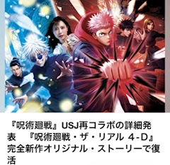 みさきです こんちゃ 気になるニュースコーナー 今回の気になるニュースは ユニバ呪術廻戦再コラボ 再コラボなんや 知らんかった 1回目乗ってないわわたし まぁ呪術廻戦あんまり ハマってないからいんやけど けどこの4Dシリーズ好きやから これは行きたい 乗りたいです けどこれめっちゃ回転率悪くて めっちゃ並ぶねんな 240分とか普通にいくんよ 平日でも180分とかいくで なんでぇぇって感じ まぁアニメは置いておいて 4Dジェットコースターは めっちゃ楽しいんよね 並んで乗る価値はあります どんな感じかコラボ楽しみだ 絶対行きます ではでは!また みさき