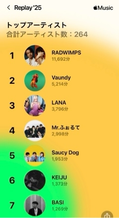 こんにちはあかねです 昨日上げた今年1番聴いた曲 の別バージョンでアーティストも載っけちゃう まあもちろんRADWIMPSやよね(*^^*) 大好きなアーティストが並んでいるこの表 素晴らしいよね、ロック画面にしようかな ってぐらい今年はこのアーティストさん達に お世話になりました𐔌՞⁔•͈ ·̫ •͈⁔՞𐦯⋆꙳ でもKEIJUがランクインしてるのは 予想外 ありがとうKEIJU それじゃまた!! あかね