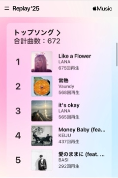 こんばんはあかねです えっぐ!!!!、さっむ!!!!!! 冬が本気出してきやがった 12月になったからってこんな簡単に 寒くなっていいもんなん?!?!ねえ?!?!💢 しかも今日雪降るらしーよっ ちこっと早い気もするけど、雪は好きなので るんるんはしてるっ てか、早く降るのはええけど クリスマスは絶対降ってくれよ ホワイトクリスマスがええんやあかねは あのエモい瞬間を味あわせてくれ ってことで完全に冬ですが 今年が終わりかけということで 今年沢山聴いた曲がAppleMusicで 振り返れてね 今年いっぱい聴いた曲がこのラインナップ どれも夏にめちゃめちゃ聴いた☀️🍉🌻 この5曲まじでお気に入りソングすぎて 1曲ずつリピートしまくったなあ とりあえずこのラインナップは あかねのサマーソング なんなら未だに聞いてる、愛のままに でも冬は冬の曲があるから またブログにでも載せます💌 それじゃあ!!! みんな暖かくしろよお、風邪ひくなよお 12月あっためてくれい んじゃまた あかね