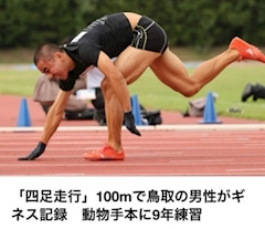 みさきです こんちゃ 気になるニュースコーナー 今日のニュースは この方ね わたし知ってたの まさかニュースに出るとは 鳥取の人なんですけど 四足歩行でギネス目指してる人で Aぇ!groupの番組に 出てたんです まさかのギネス記録更新とわ 凄すぎる そもそも四足歩行しようなんて 思わないじゃないですか 凄いですよねその頭になるのが ちゃんと動物さん見て たくさん研究したんだろうなって 番組出てた時もメンバー2人が チャレンジしてたんですけど めっちゃ難しそうだったもんな 四足歩行だけど 足と手の出す順番とか 動物によって全然違うんですよ この人のニュース見た時 勝手に1人で親近感湧いてました ではでは!また みさき