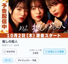こんばんはあかねです 今日は秋の新ドラマ紹介木曜日枠🍁 気になったの1個しかないけど、紹介します 「推しの殺人」 殺人の隠蔽をきっかけに 連続殺人事件に巻き込まれていく女性3人の物語 若手の女優さんもいたり気になったので…💭 この女性3人はアイドルらしくて 殺人の隠蔽を隠しながらアイドルをしてるって すごい状況すぎる笑 ミステリードラマみたいなので 毎週考察が楽しそうでふ 10月2日 深夜から‼️ ━━━━━━━━━━━━━━━ もうすっかり秋だね、涼しくなってる お昼とかもあっつい‼️って胸張って言えやんくなった この前なんてお昼長袖で気持ちよかったよ 秋、さあこい んじゃまたっ あかね