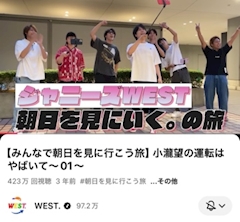 みさきです やっほほ ゆーっくりと東京着いて いまディズニーランドいます 今日はランドの日 お昼からゆっくりスタート 明日もあるから 今日は程よく遊んで 明日に備えるです ホテルも楽しみ 久しぶりの泊まり お酒なんか飲んじゃおっかな 早く寝てシー楽しみたい てことでYouTube紹介 今日はWEST.から紹介 今回はWEST.みんなでの 旅行企画 みんなで朝日を見に行こう のんちゃんの運転でスタート 中々運転しないのんちゃん 運転係になって みんなでコンビニ寄って あきとくんがみんなの 好きそうなの買ってきて 仲間想いだなって感動 わちゃわちゃドライブがてら 運転してる中 のんちゃん道間違えるという 旅あるあるですね 間違えたというか 東京駅の地下行っちゃって みんなでワイワイ 楽しそうなWESTさん 末っ子感のんちゃん 甘やかされてるなって わたしもあの車に乗りたいよ なんか推しというか わちゃわちゃ友達として 参加したいよあれは 楽しそうなWESTさん達 見てみてください ではでは!また みさき