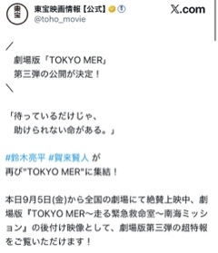 こんばんはあかねです みんな、今公開されとるMERって映画観た?? あかねはもう観たんやけど なんとなんと、来年の第三弾の続編が発表されて !!!!! またTOKYO MERとして第三弾です❕ 嬉しい~また東京で集まるのかあ⸝⸝- ̫ -⸝⸝ 今回の映画は南海MERっていって 沖縄の方の離島がメインの映画やったから 東京MERのメンバーは主役ではなかったんよね やから来年またあのメンバーが集まるのが 嬉しいすぎるっっっ!! 来年また観に行くからねー!亮平さん‼️ 出動楽しみにしてます‼️ それじゃまたっ あかね
