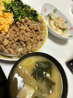 みさきです おはようございます 今日パーソナルなんだけど イボの治療行かなきゃで これやると歩けなくなるの だからパーソナル無理じゃん 痛くなるからさ 色々予定あるとやらなくなって 2、3週間だからもう行かないと 今日からしばらく無理で 今日しかないのよ だからいま問い合わせ中 ほんと痛くてやなんだよね 頑張ろっと 料理日記いくぜ 久しぶりの料理紹介だよ 今回の献立は 三色丼献立 1品目 三色丼 ちょっとボリューミー なんか配分ミスっちゃった けど美味しくてバクバク食べた けど多くて次の日食べました いつも2色だけど ほうれん草付け加えてみた 2品目 卵きゅうりサラダ 食べやすいし量最適 きゅうりはさ臭いから マヨネーズとかありがたいです 卵も無駄にならなくて済む 素敵なサラダ 3品目 ネギ豆腐わかめ はい王道来ました この味噌汁が1番好き 大好きなの ネギの味が出てくるから なんかおいしいんだよね 味噌汁具材に味変わるのよ 試してみてください ではでは!また みさき